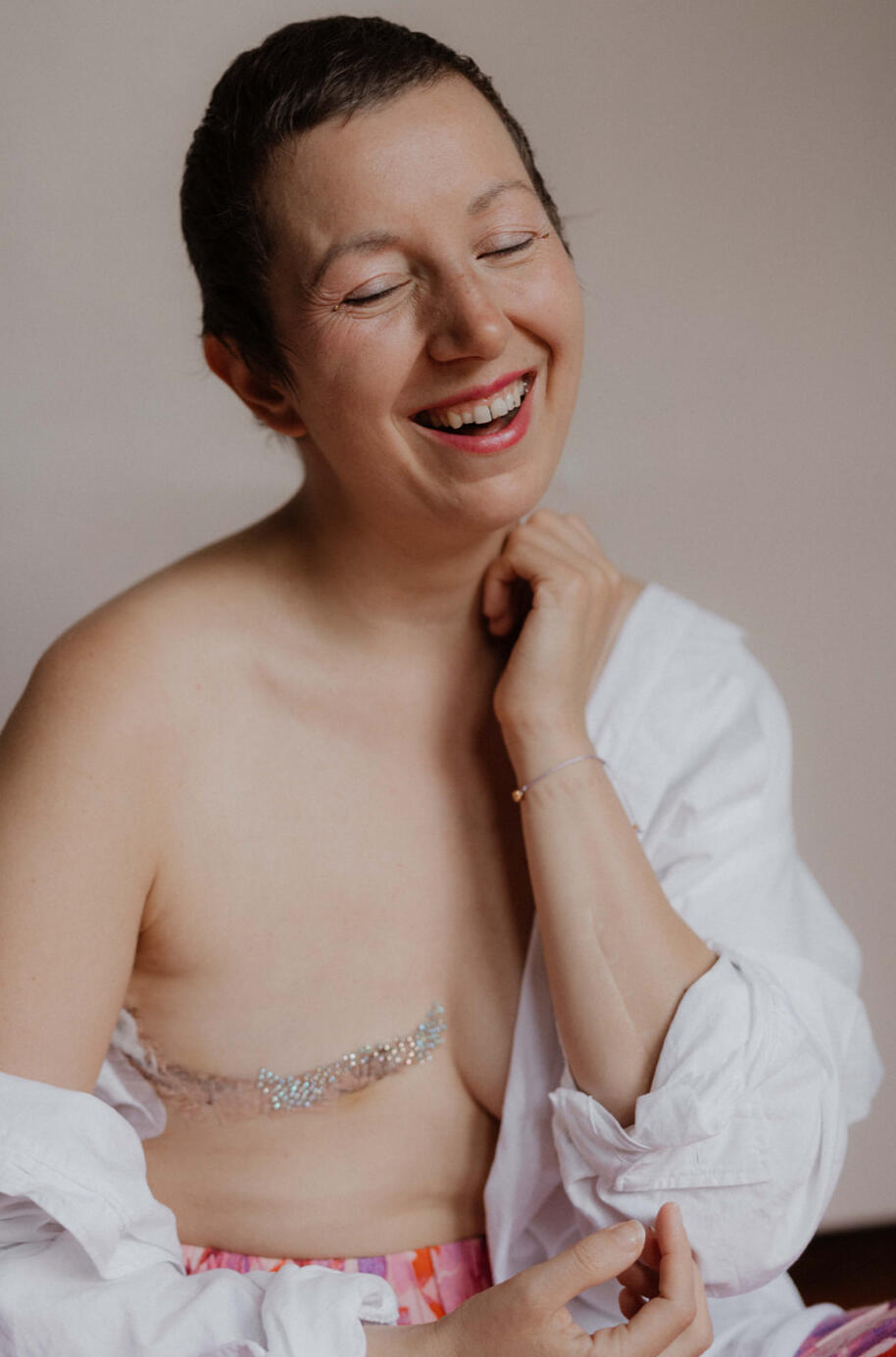 Unendlich tief.Das Trauma sitzt tief und der Brustabdruck erinnert an meine linke Brust. Er tröstet. Meine linke Brust ist jetzt auch weg und ich lebe flach. Den Bauch sehe ich jetzt immer als erstes aber das ist egal, weil ich gesund bin!Der Krebs hat mir unendlich viel genommen. Aber niemals mein Lachen – und darauf bin ich stolz.In der schwersten Zeit meines Lebens habe ich mich oft